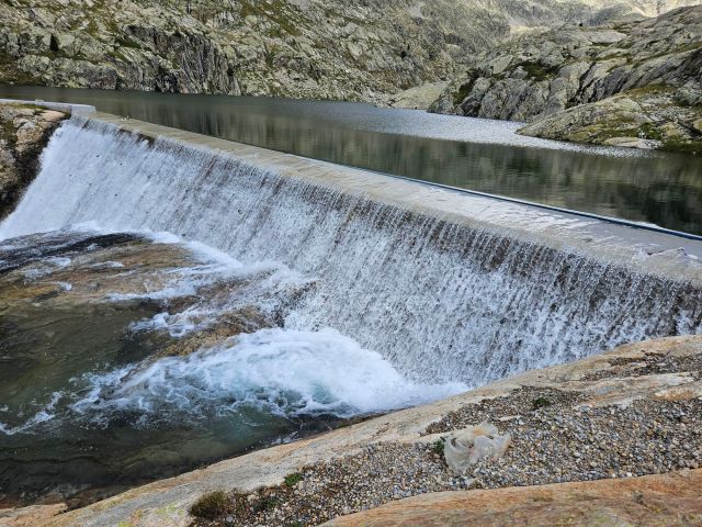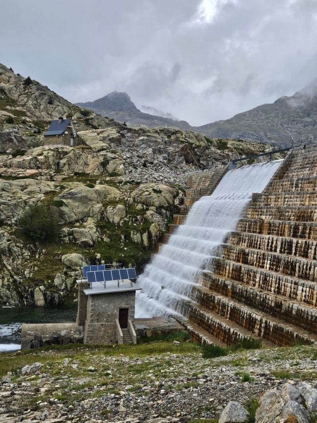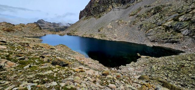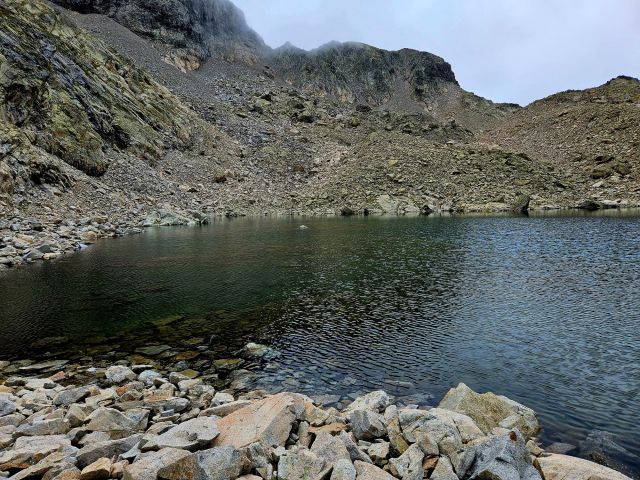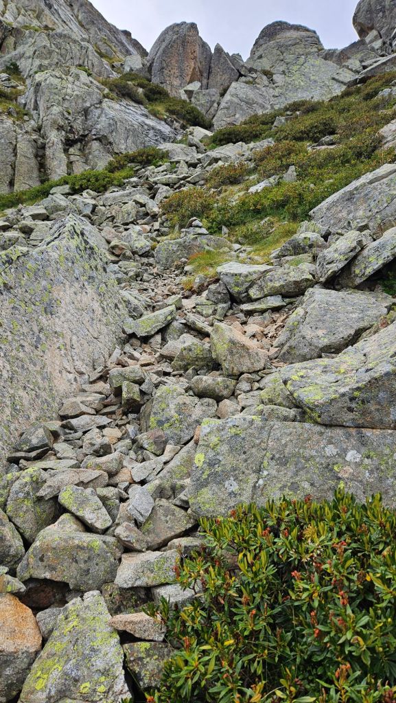 From here I start a steady climb to Port du Marcadau 2541m – the pass that is going to take me over to France. In the sunny weather the views would be stunning, but even in this rain there’s enough drama to make you wonder. The path snakes up and at some point gets surprisingly green. It might be because of the recent rains, I don’t know. It just made me think because it’s quite high and a quite exposed slope. I even saw a flock of sheep – the first on the Spanish side.